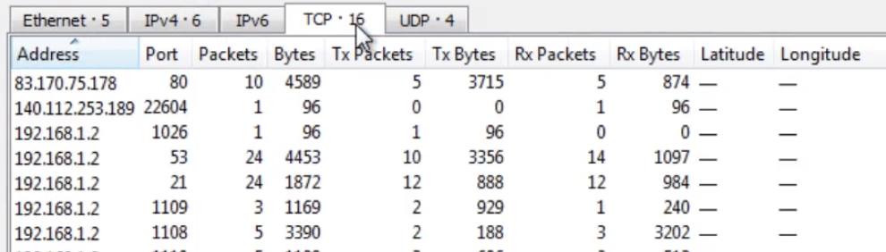 Onder Statistieke –> Opgeloste Adresse kan jy verskeie inligting vind wat deur wireshark “opgelos” is soos poort/transport na protokol, MAC na die vervaardiger, ens. Dit is interessant om te weet wat betrokke is in die kommunikasie.