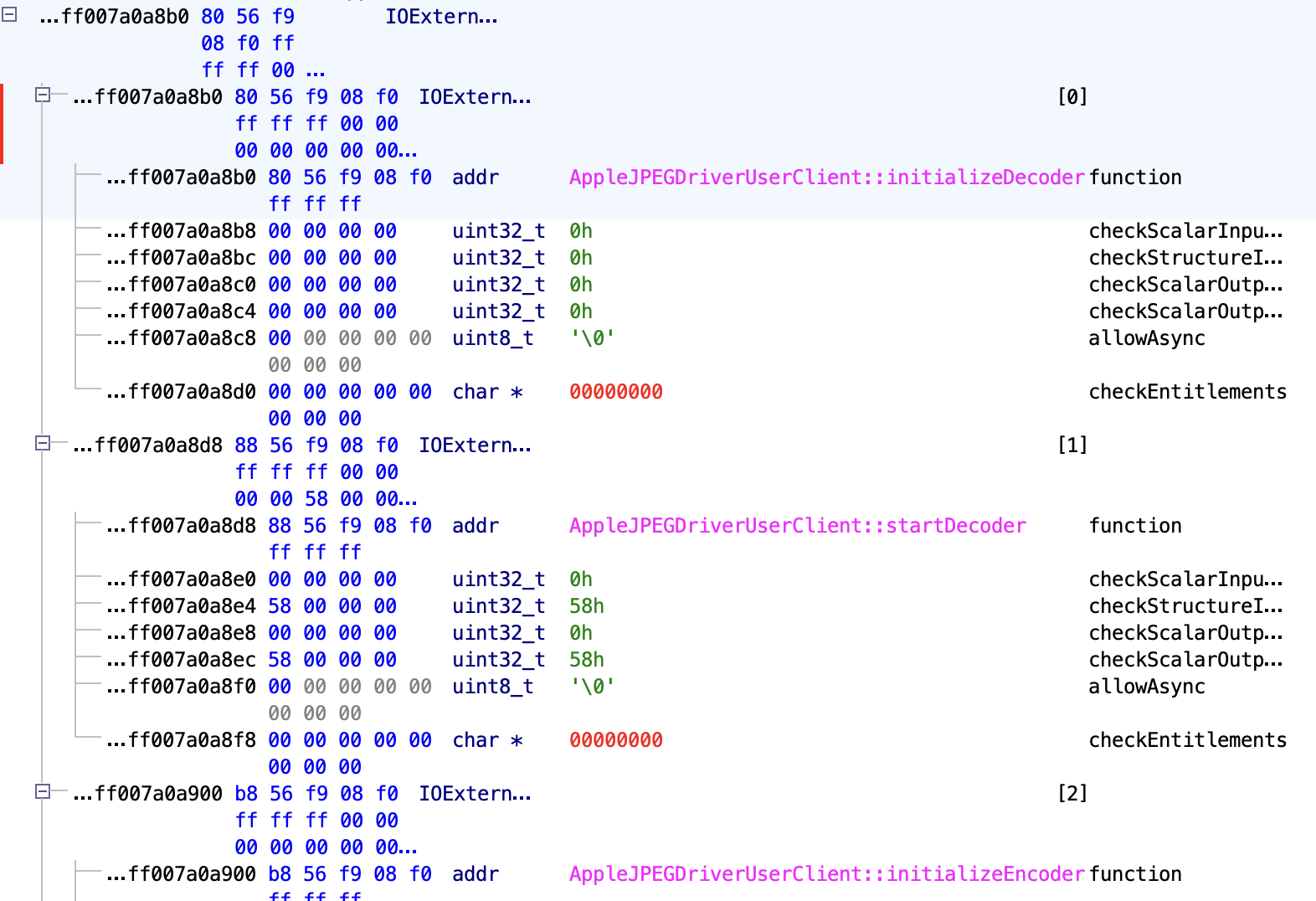 Nou, as jy die (IOExternalMethodDispatch2022 *)&sIOExternalMethodArray volg, sien jy baie data: