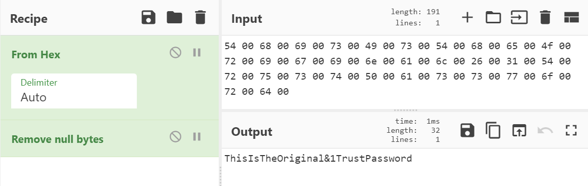 Die duidelike teks wagwoord kan verkry word deur die [ CLEAR ] uitvoer van mimikatz van hexadecimaal te omskakel en null bytes ‘\x00’ te verwyder: