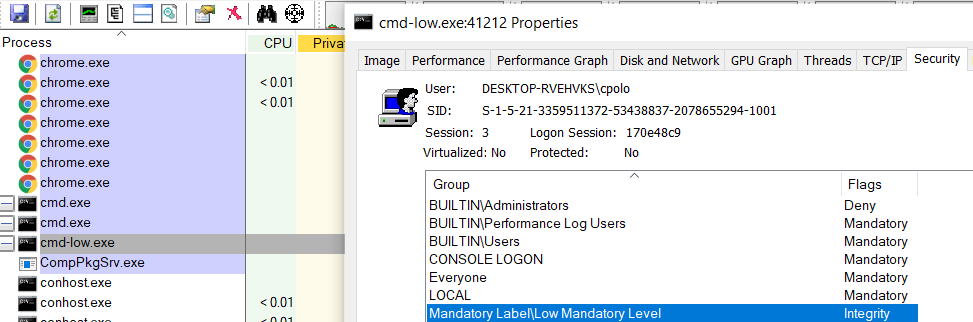 Nou, wanneer ek cmd-low.exe uitvoer, sal dit onder ’n lae-integriteitsvlak loop in plaas van ’n medium een: