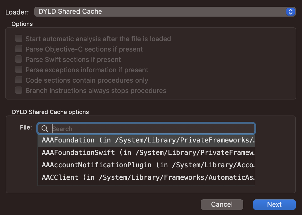 dyld_shared_cache_utilnicht funktioniert, Sie das geteilte dyld-Binärformat an Hopper übergeben können und Hopper in der Lage sein wird, alle Bibliotheken zu identifizieren und Ihnen zu ermöglichen, auszuwählen, welche Sie untersuchen möchten: