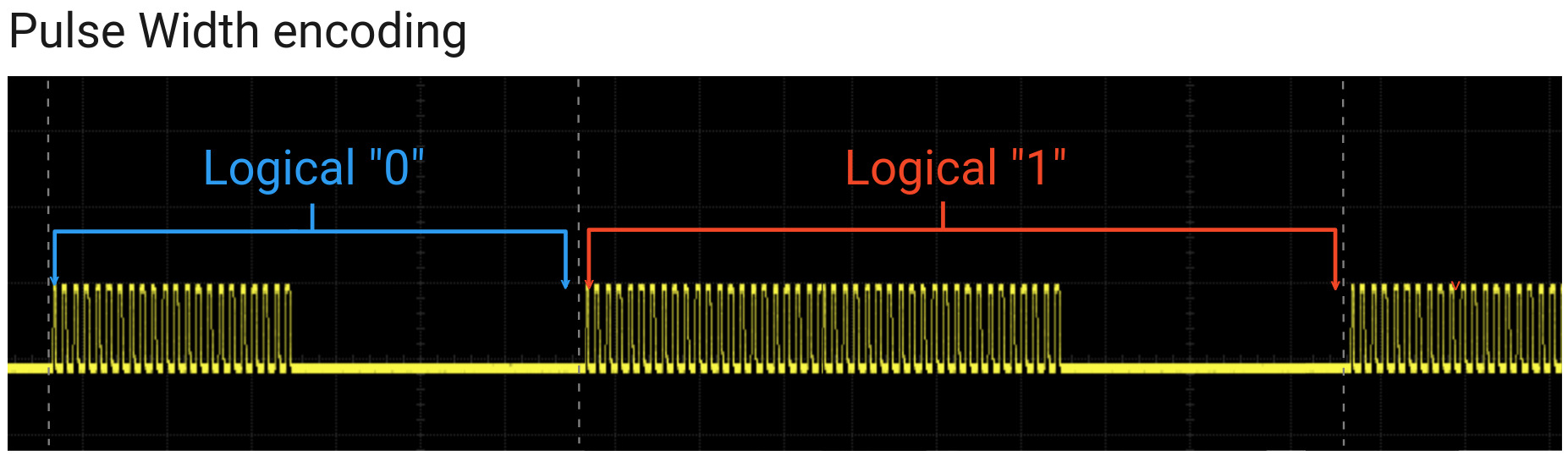 Bits werden durch Modulation der Pulsbreite kodiert. Die Breite des Abstands nach dem Pulsstoß ist konstant.