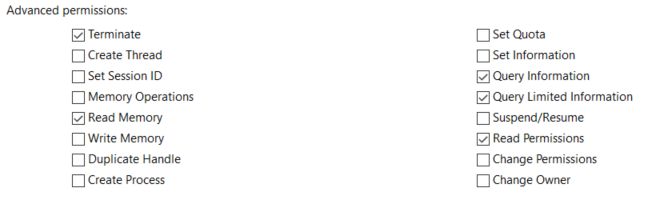 Das vorherige Bild enthält alle Berechtigungen, die “Administratoren” über den ausgewählten Prozess haben (wie Sie sehen können, haben sie im Fall von svchost.exe nur “Abfragen”-Berechtigungen)
