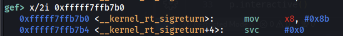 Επομένως, αν διαρρεύσει, είναι δυνατόν να χρησιμοποιηθεί αυτή η διεύθυνση για να αποκτηθεί πρόσβαση σε ένα sigreturn αν το δυαδικό δεν το φορτώνει: