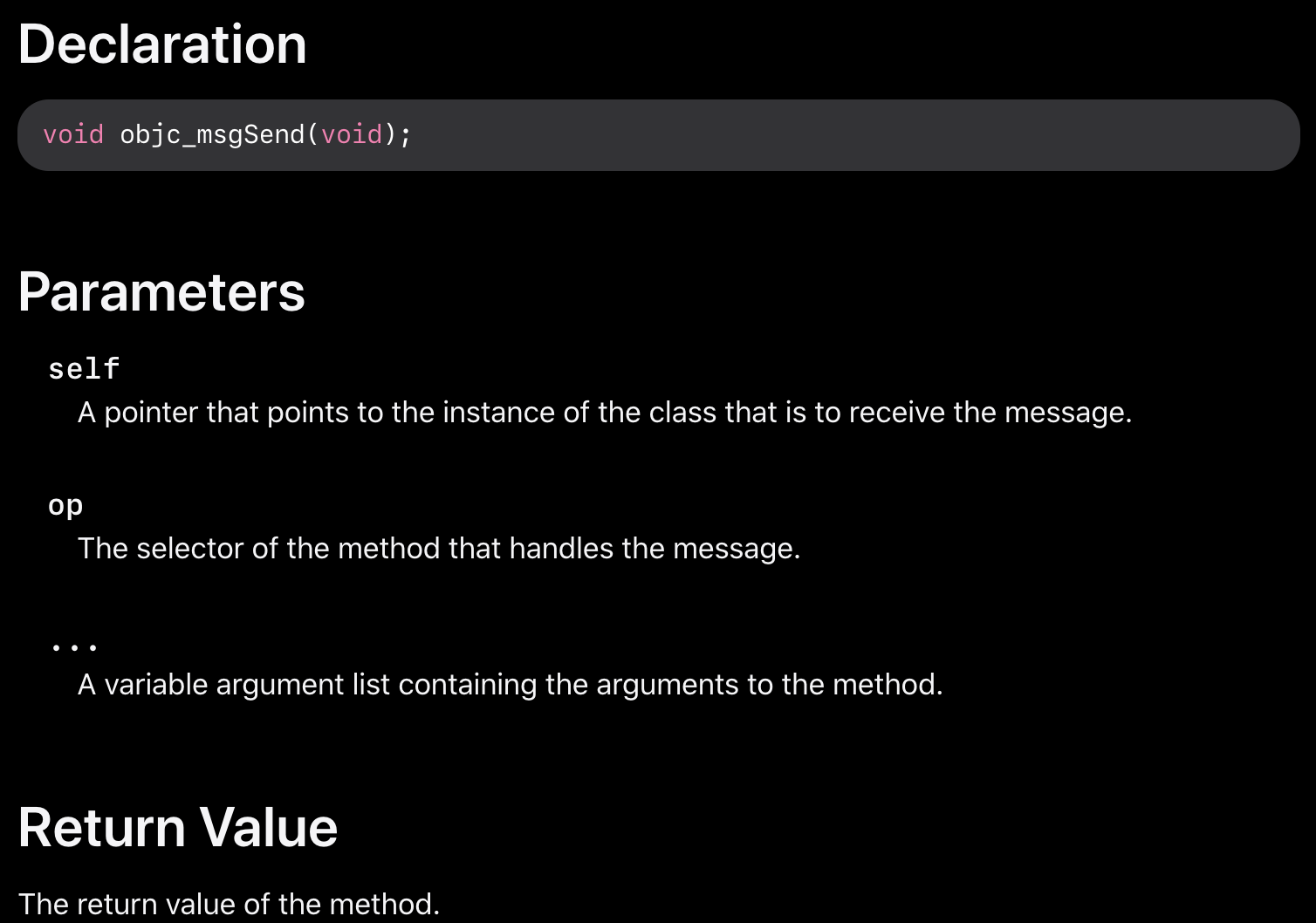 Όταν καλείται μια συνάρτηση σε ένα δυαδικό που χρησιμοποιεί Objective-C, ο συμπιεσμένος κώδικας αντί να καλεί αυτή τη συνάρτηση, θα καλέσει objc_msgSend. Αυτό θα καλεί τη τελική συνάρτηση: