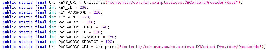 content://com.mwr.example.sieve.DBContentProvider/Passwords