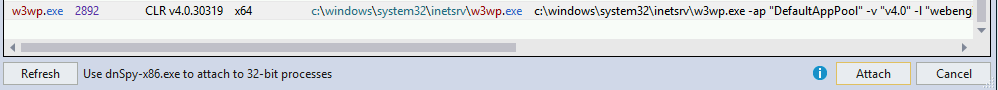 Στη συνέχεια, επιλέξτε w3wp.exe για να συνδεθείτε με τον διακομιστή IIS και κάντε κλικ στο σύνδεση:
