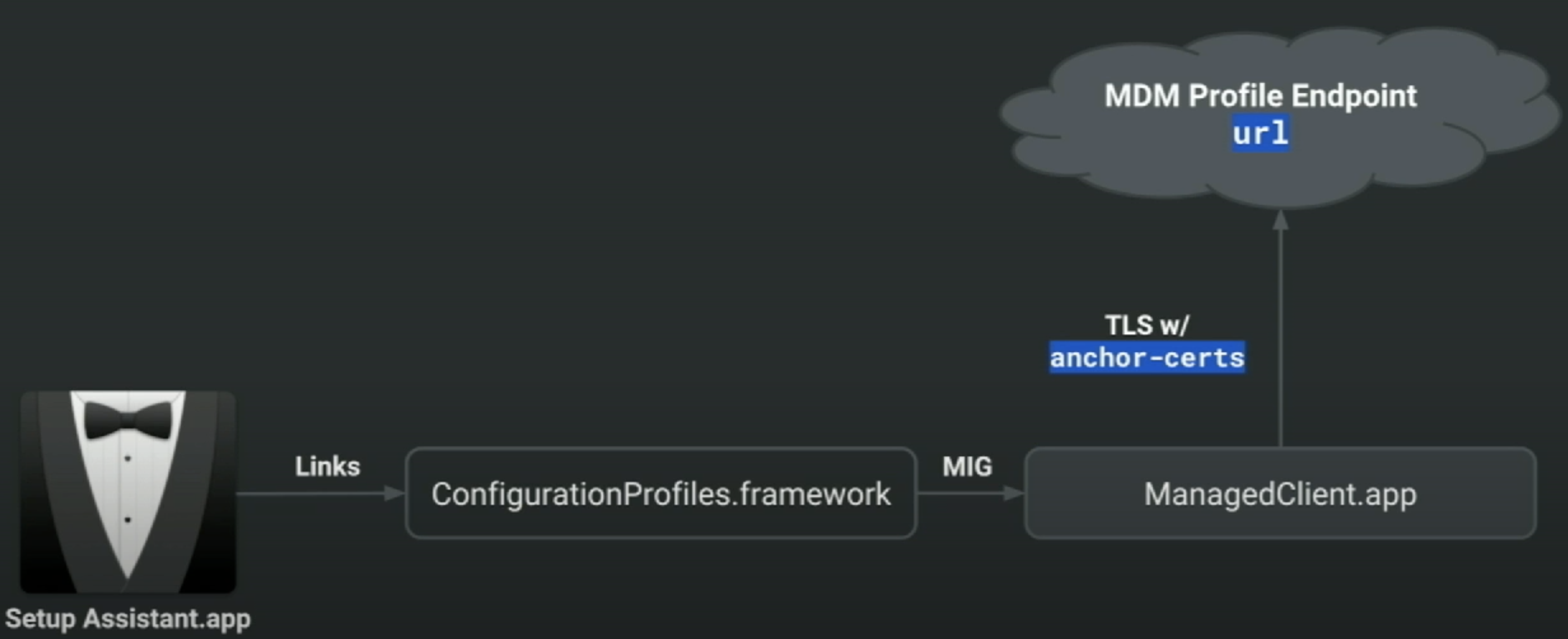 com.apple.mdm: to enroll the device in MDMcom.apple.security.scep: to securely provide a client certificate to the device.com.apple.security.pem: to install trusted CA certificates to the device’s System Keychain.- Installing the MDM payload equivalent to MDM check-in in the documentation