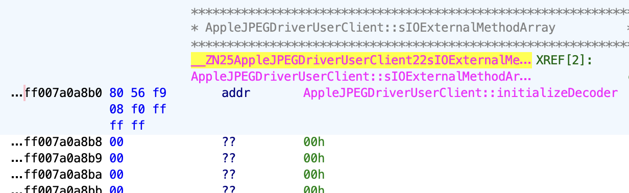Now, following the (IOExternalMethodDispatch2022 *)&sIOExternalMethodArray you can see a lot of data: