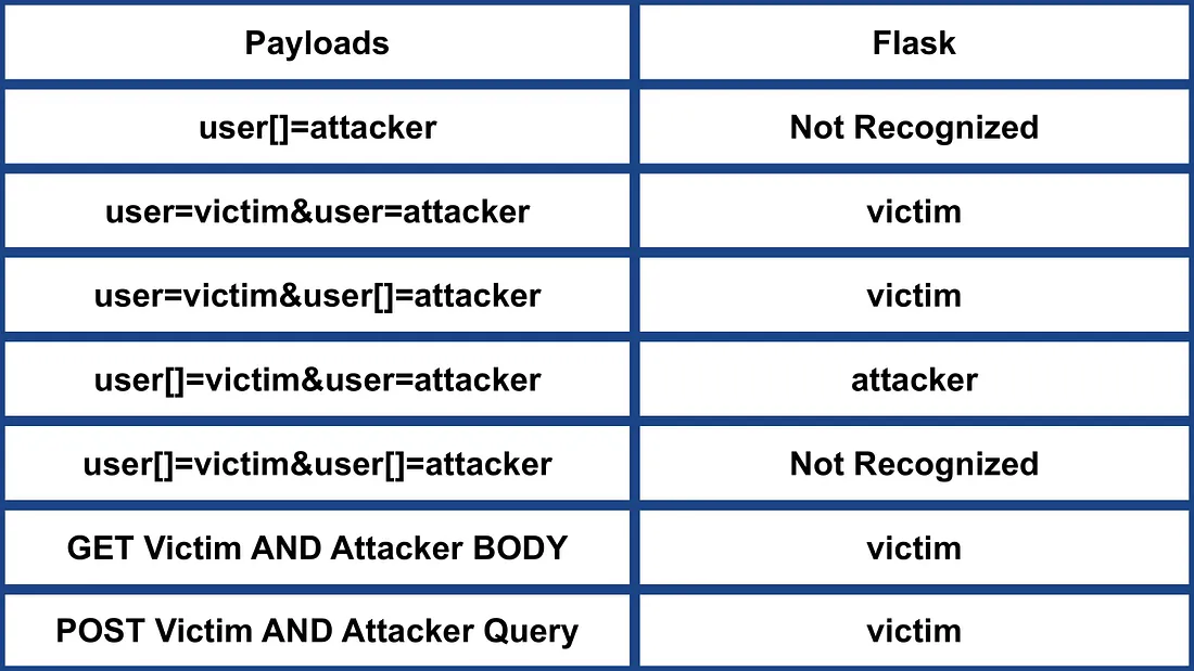 - Flask: Adopts the first parameter value encountered, such as