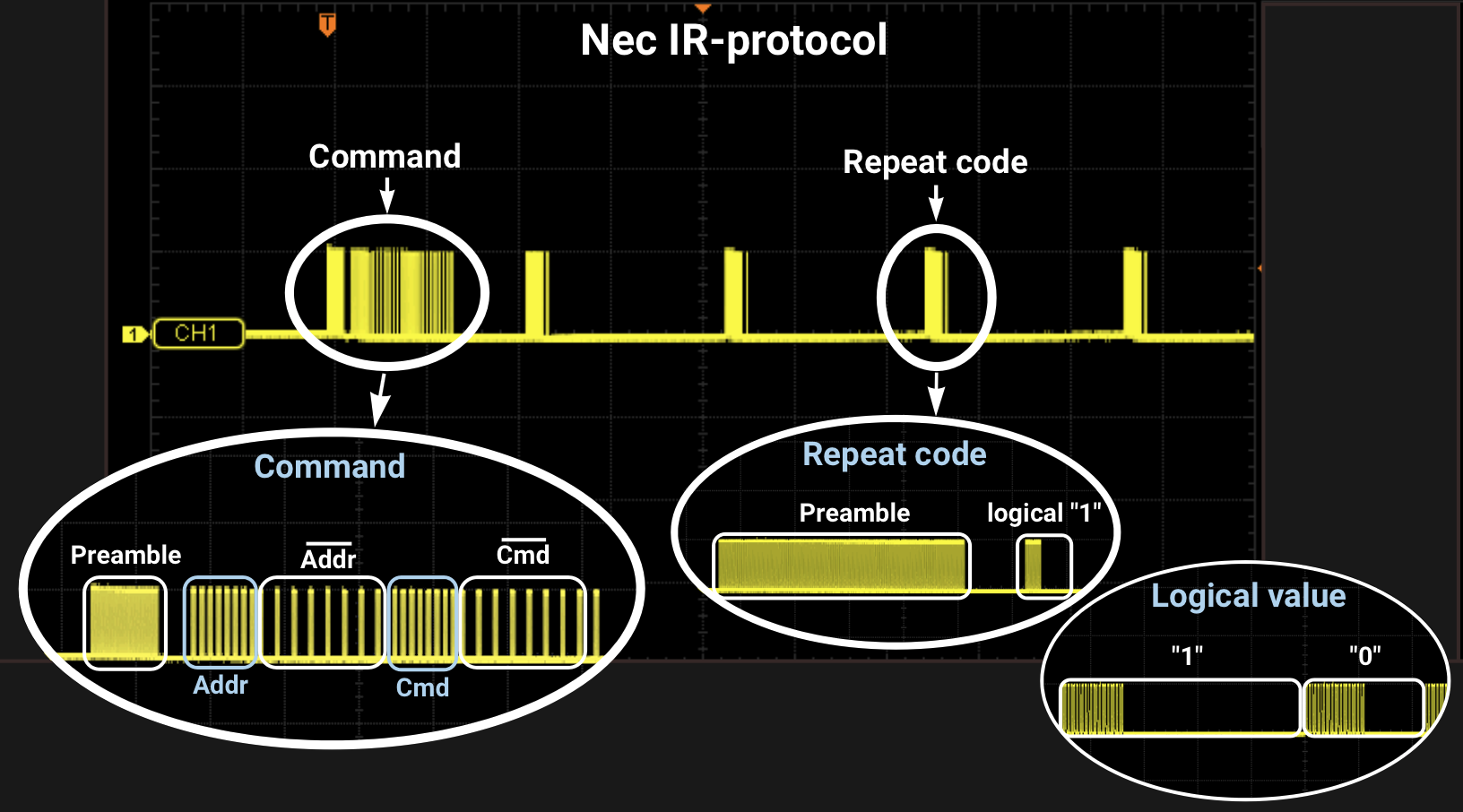 The most reliable way to see how the remote IR signal looks like is to use an oscilloscope. It does not demodulate or invert the received signal, it is just displayed “as is”. This is useful for testing and debugging. I will show the expected signal on the example of the NEC IR protocol.