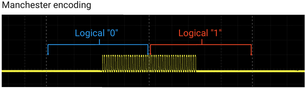 It is also known as Manchester encoding. The logical value is defined by the polarity of the transition between pulse burst and space. “Space to pulse burst” denotes logic “0”, “pulse burst to space” denotes logic “1”.
