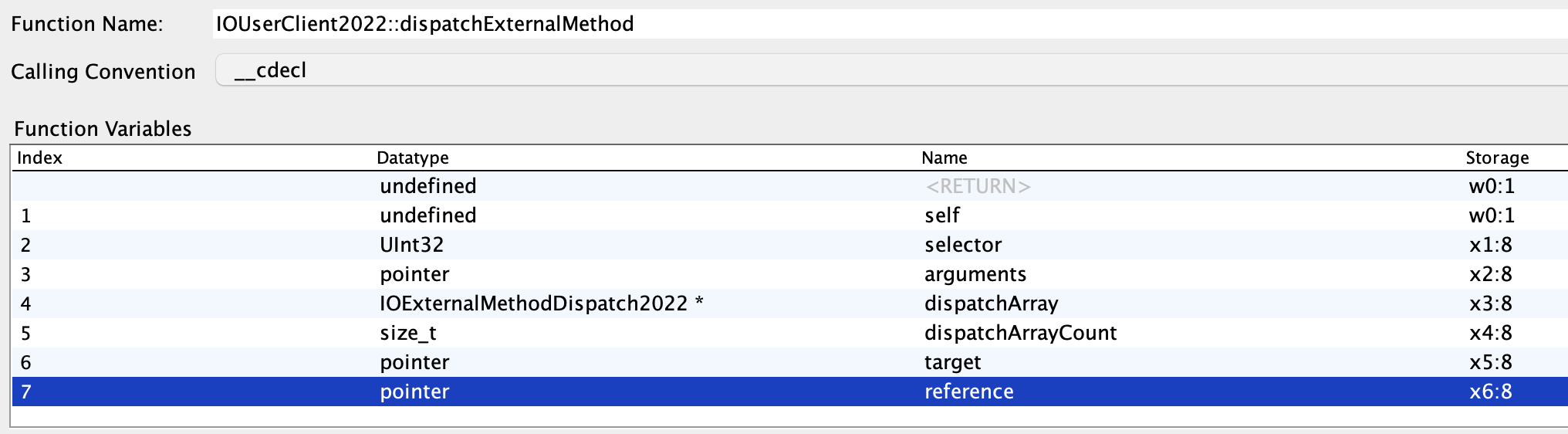 Para el siguiente paso necesitamos tener definida la estructura IOExternalMethodDispatch2022. Está en opensource en https://github.com/apple-oss-distributions/xnu/blob/1031c584a5e37aff177559b9f69dbd3c8c3fd30a/iokit/IOKit/IOUserClient.h#L168-L176, podrías definirla:
