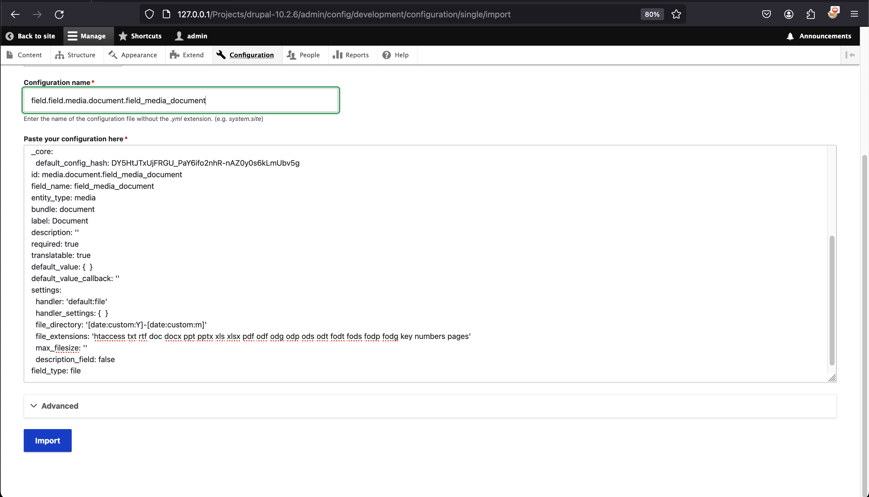 - /admin/config/development/configuration/single/import
