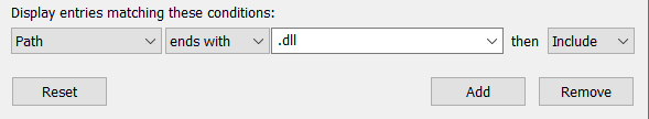 Si buscas una dll faltante dentro de un ejecutable específico deberías establecer otro filtro como “Process Name” “contains” <exec name>, ejecutarlo y detener la captura de eventos.