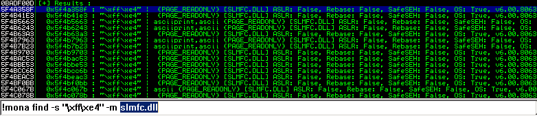 !mona find -s "\xff\xe4" -m slmfc.dll # Example in this case