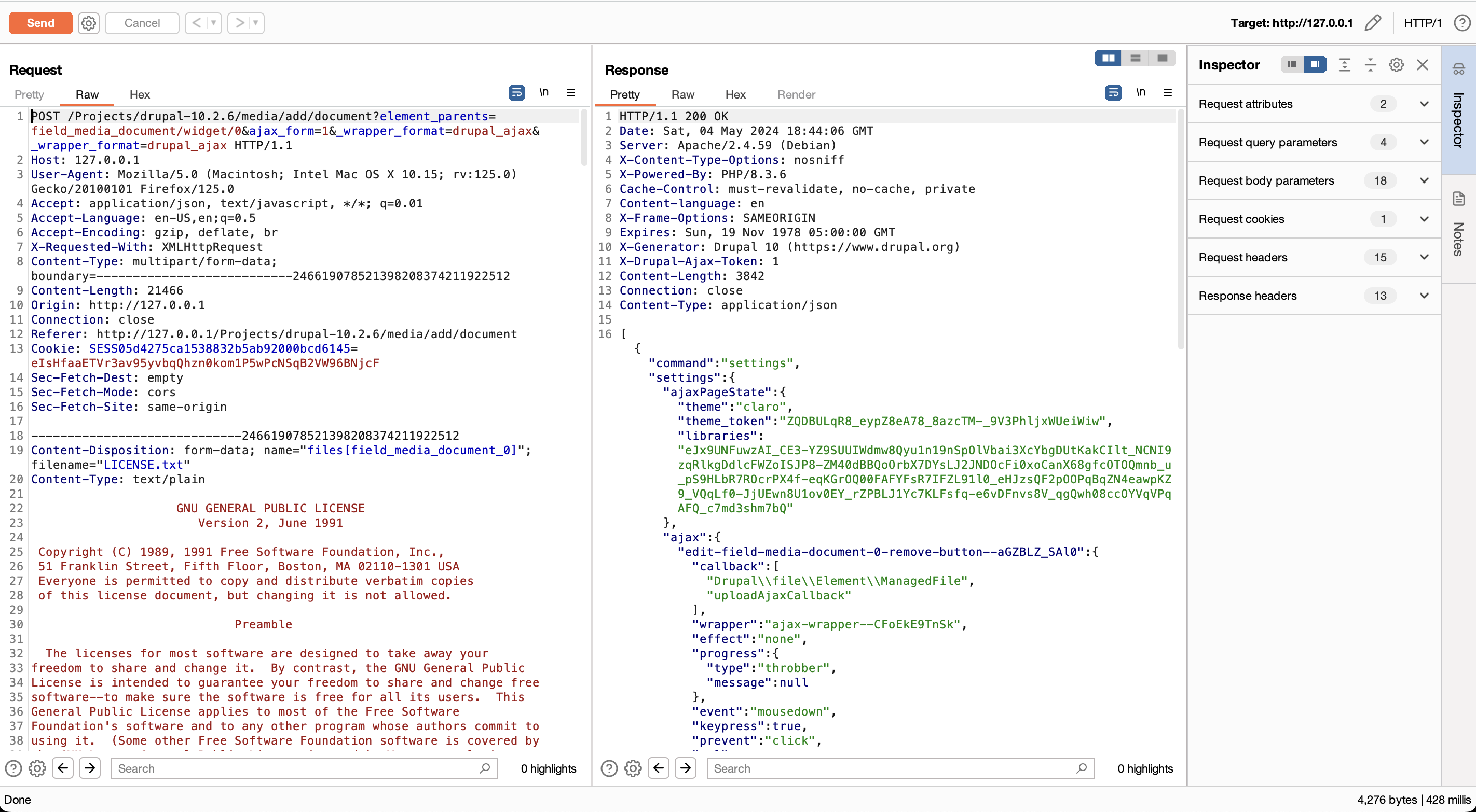 Then, we leverage the Add Document (/media/add/document) feature again to upload a Webshell hidden within a license file.