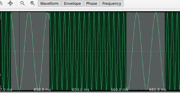 Dans l’image précédente, vous pouvez observer assez bien que 2 fréquences sont utilisées, mais si vous observez la forme d’onde, vous pourriez ne pas être en mesure d’identifier correctement les 2 fréquences différentes :