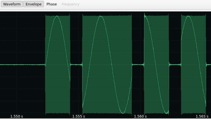 Vérifiant les informations AM avec SigDigger et en regardant simplement l’enveloppe, vous pouvez voir différents niveaux d’amplitude clairs. Le signal utilisé envoie des impulsions avec des informations en AM, voici à quoi ressemble une impulsion :