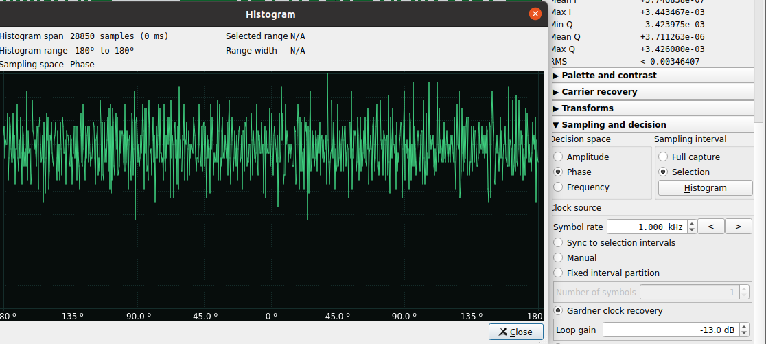 Ayant trouvé qu’il s’agit d’un signal modulé en AM et le taux de symbole (et sachant que dans ce cas quelque chose en haut signifie 1 et quelque chose en bas signifie 0), il est très facile d’obtenir les bits encodés dans le signal. Donc, sélectionnez le signal avec des informations et configurez l’échantillonnage et la décision, puis appuyez sur échantillon (vérifiez que l’Amplitude est sélectionnée, le taux de symbole découvert est configuré et la récupération d’horloge Gadner est sélectionnée) :