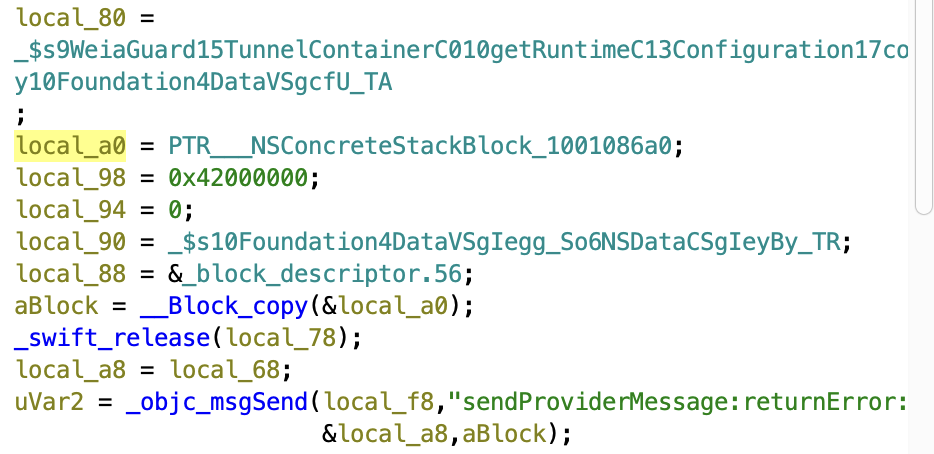 वर्तमान में Ghidra न तो ObjectiveC dispatch_block_t संरचना को समझता है, न ही swift_dispatch_block को।