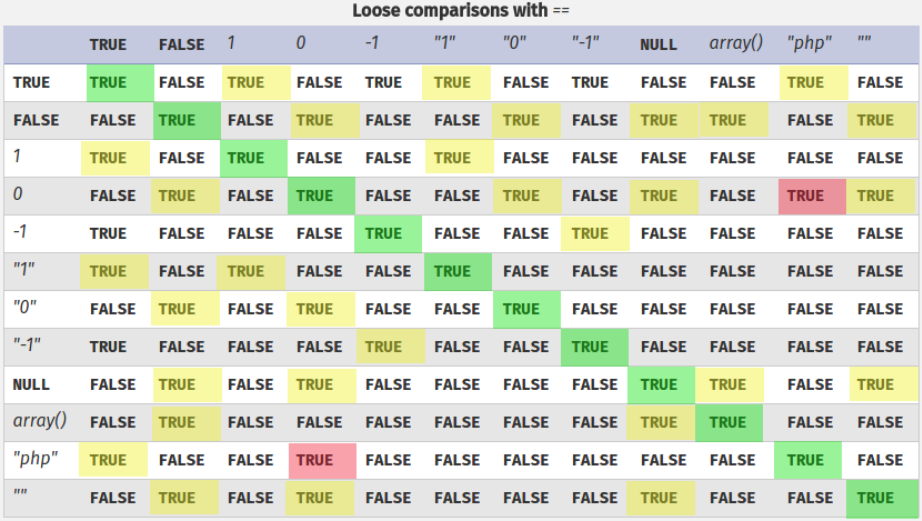 PHP तुलना तालिकाएँ: https://www.php.net/manual/en/types.comparisons.php