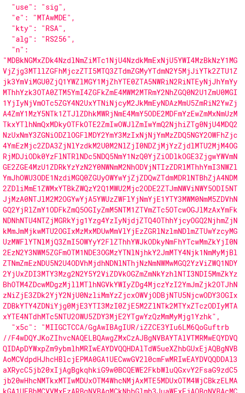 X.509 URL. एक URI जो PEM फॉर्म में एन्कोड किए गए X.509 (a certificate format standard) सार्वजनिक सर्टिफिकेट्स के सेट की ओर इशारा करता है। सेट में पहला सर्टिफिकेट वही होना चाहिए जिसका उपयोग इस JWT पर साइन करने के लिए किया गया था। उसके बाद के सर्टिफिकेट हर एक पिछले सर्टिफिकेट पर साइन करते हैं, इस तरह certificate chain पूरी होती है। X.509 is defined in RFC 52807 . Transport security is required to transfer the certificates.