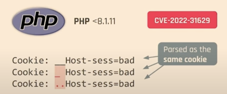 Or in PHP it was possible to add other characters at the beginning of the cookie name that were going to be replaced by underscore characters, allowing to overwrite __HOST- cookies: