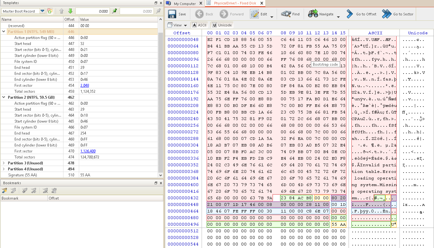 Se fosse stata una tabella GPT invece di un MBR, dovrebbe apparire la firma EFI PART nel settore 1 (che nell’immagine precedente è vuoto).