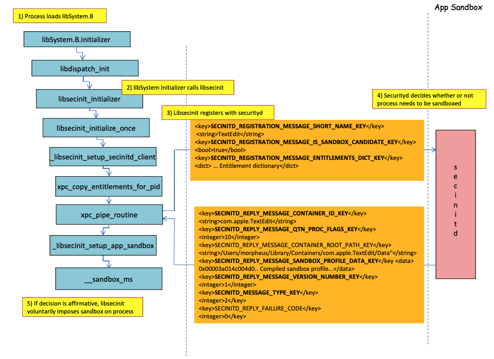 Poi, libSystem.B chiamerà altre diverse funzioni fino a quando xpc_pipe_routine invia i diritti dell’app a securityd. Securityd controlla se il processo deve essere messo in quarantena all’interno del Sandbox, e se sì, verrà messo in quarantena.