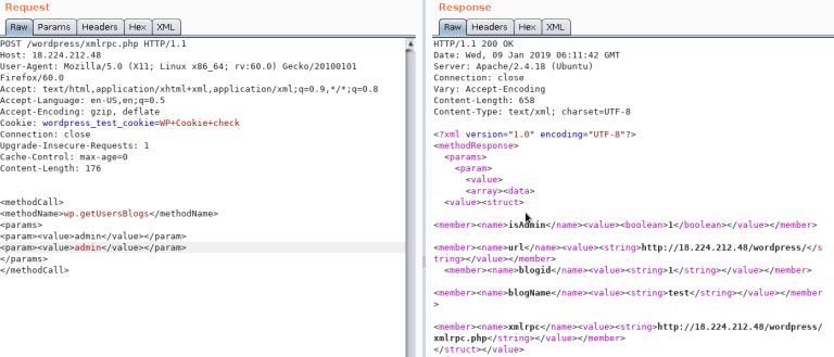 wp.getUserBlogs, wp.getCategories o metaWeblog.getUsersBlogs sono alcuni dei metodi che possono essere usati per effettuare un brute-force sulle credenziali. Se riesci a trovare uno di essi puoi inviare qualcosa del tipo: