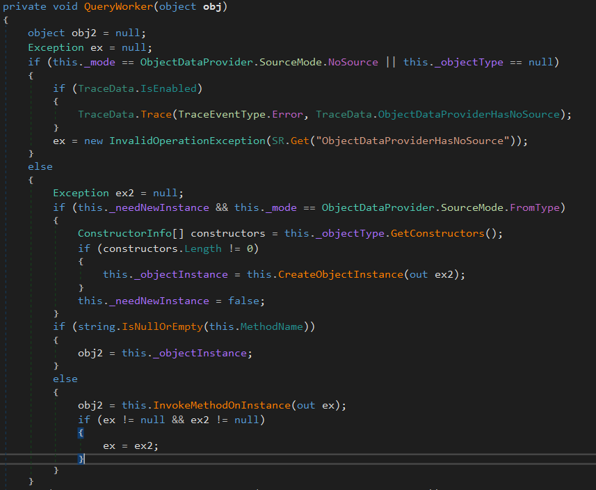 Nota che questo non è il codice completo della funzione QueryWorker ma mostra la parte interessante: il codice chiama this.InvokeMethodOnInstance(out ex); questa è la riga in cui viene invocato il metodo impostato.