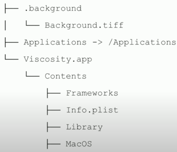DMGファイルの階層は、内容に基づいて異なる場合があります。ただし、アプリケーションDMGの場合、通常は次の構造に従います: