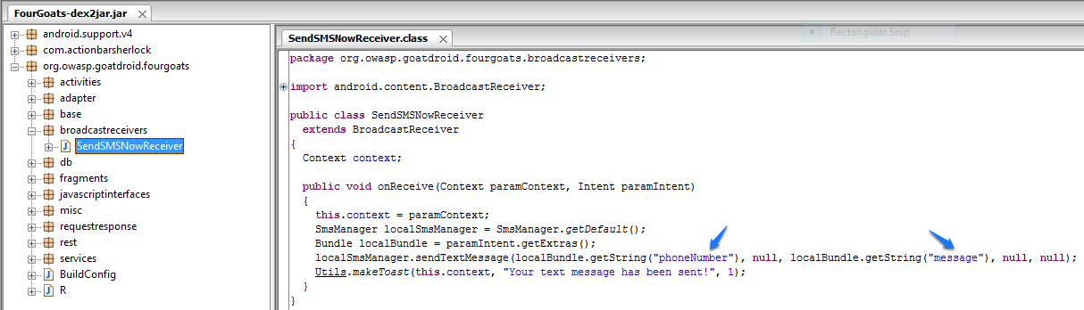 このBroadcast Receiversを発見した後は、コードを確認するべきです。特に**onReceive**関数に注意を払ってください。これは受信したメッセージを処理します。