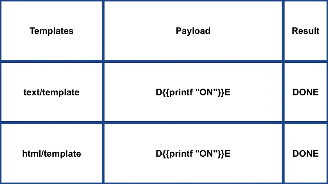 Go のテンプレートエンジンでは、その使用確認は特定のペイロードで行えます: