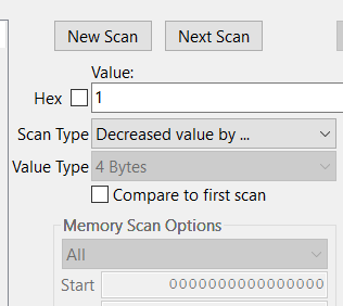 次に、値が変更されるような操作を行い、ゲームを停止して次のスキャンを実行します:
