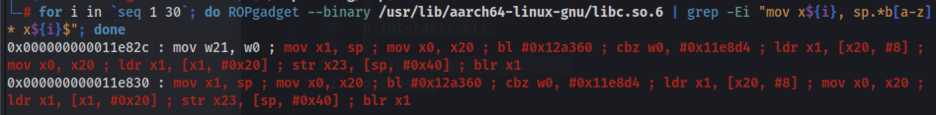 ROPgadget --binary /usr/lib/aarch64-linux-gnu/libc.so.6 | grep -Ei "[mov|add] x${i}, sp.* ; b[a-z]* x${i}( |$)";
