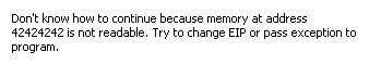 이 buffer로 인해 EIP가 크래시되었을 때 가리키는 값은 42424242(“BBBB”)여야 한다.