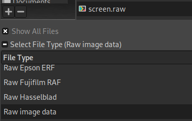 To 열기 the raw image you can use GIMP, select the screen.raw file and select as file type Raw image data: