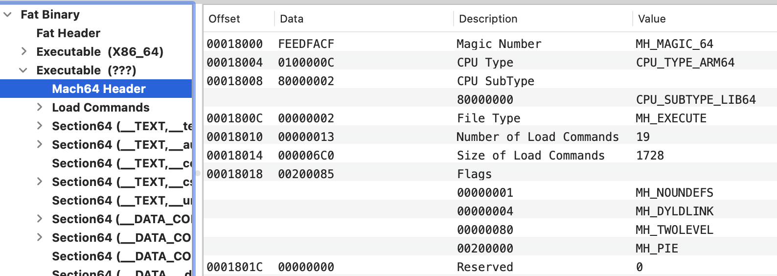 헤더에는 Mach-O 파일로 식별하기 위한 magic 바이트와 대상 아키텍처에 대한 정보 등 파일의 기본 정보가 포함됩니다. 다음에서 찾을 수 있습니다: mdfind loader.h | grep -i mach-o | grep -E "loader.h$"
