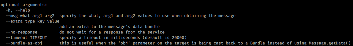 먼저 “msg.what” 안의 데이터를 전송한 다음, “msg.arg1“과 “msg.arg2“를 전송합니다. 어떤 정보가 사용되고 있는지 코드 안에서 확인해야 합니다.--extra 옵션을 사용하면 “msg.replyTo“에 의해 해석되는 내용을 전송할 수 있으며, --bundle-as-obj를 사용하면 제공된 세부정보로 객체를 생성합니다.