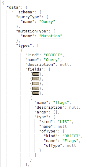 introspection에서 직접 쿼리할 수 있는 객체가 무엇인지 확인할 수 있습니다(객체가 존재한다고 해서 반드시 쿼리할 수 있는 것은 아니기 때문입니다). 다음 이미지에서 “queryType“가 “Query“라고 불리며, “Query” 객체의 필드 중 하나가 “flags“이고 이는 또한 객체 타입임을 확인할 수 있습니다. 따라서 flag 객체를 쿼리할 수 있습니다.