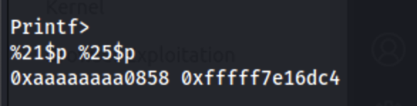Próbując różnych offsetów, %21$p can leak a binary address (PIE bypass) and %25$p can leak a libc address:
