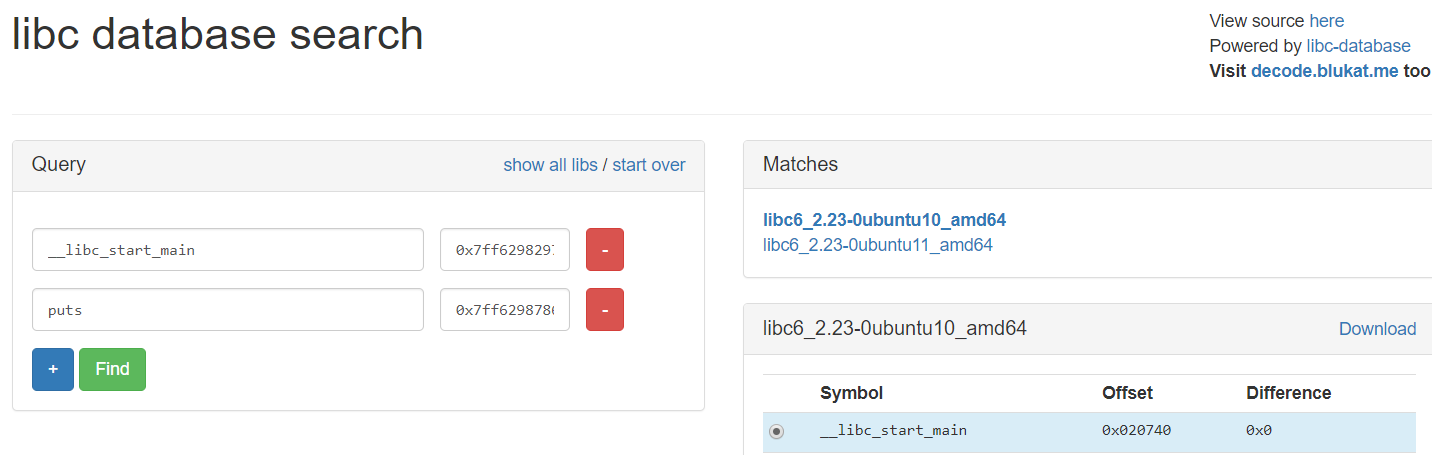 Ponieważ eksploatujemy lokalny binarny plik, nie ma potrzeby ustalać, która wersja libc jest używana (wystarczy znaleźć bibliotekę w /lib/x86_64-linux-gnu/libc.so.6).