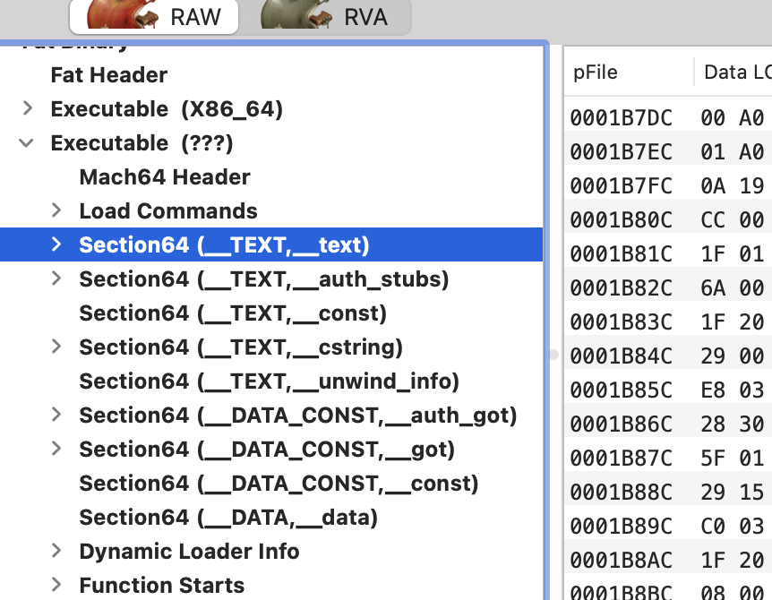 __DATA: Zawiera dane, które są do odczytu i zapisu (bez możliwości wykonania).__got:Global Offset Table__nl_symbol_ptr: Wskaźnik symbolu niedługiego (bind at load)__la_symbol_ptr: Wskaźnik symbolu leniwego (bind on use)__const: Powinny to być dane tylko do odczytu (w praktyce nie zawsze)__cfstring: Stringi CoreFoundation__data: Zmienne globalne (zainicjalizowane)__bss: Zmienne statyczne (niezainicjalizowane)__objc_*(__objc_classlist, __objc_protolist, itd): Informacje używane przez runtime Objective-C__DATA_CONST: __DATA.__const nie jest gwarantowane jako stałe (ma prawa zapisu), podobnie inne wskaźniki i GOT. Ta sekcja ustawia__const, niektóre inicjalizatory i tabelę GOT (po rozwiązaniu) jako tylko do odczytu przy użyciumprotect.__LINKEDIT: Zawiera informacje dla linkera (dyld), takie jak wpisy tablic symboli, łańcuchów i relokacji. To ogólny kontener dla treści, które nie znajdują się w__TEXTani__DATA, a jego zawartość jest opisana w innych poleceniach ładowania.- informacje dyld: Rebase, Non-lazy/lazy/weak binding opcodes oraz informacje o eksporcie