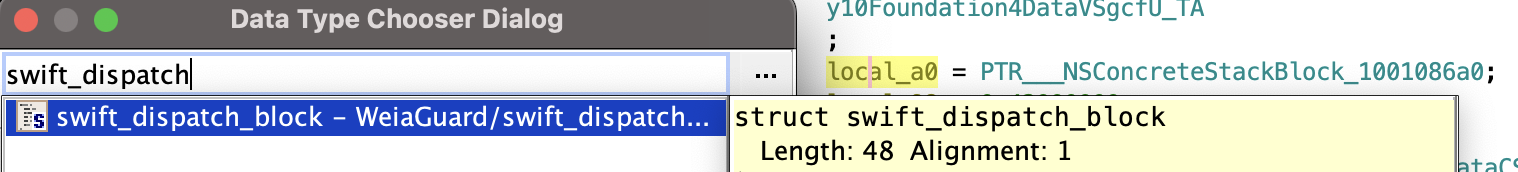 Obecnie Ghidra nie rozumie ani struktury ObjectiveC dispatch_block_t, ani struktury swift_dispatch_block.