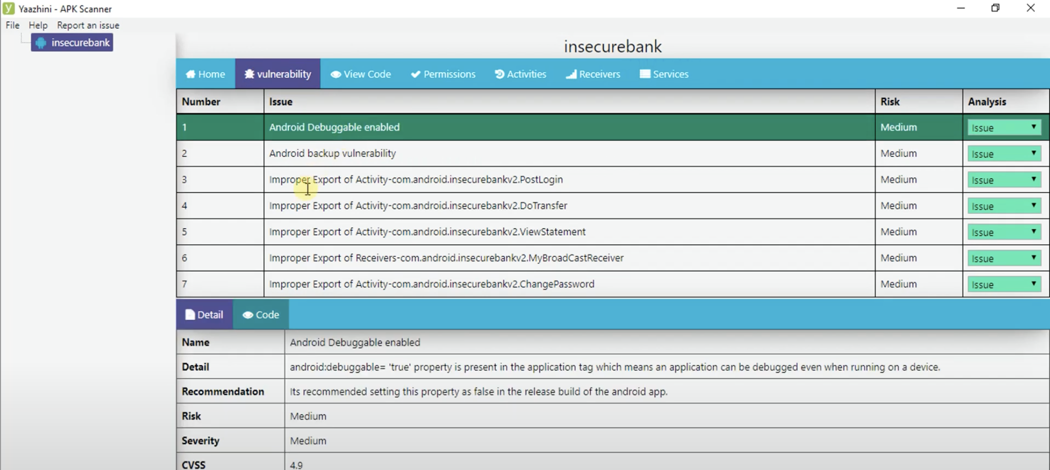 - Analyze APKs using: smalisca, ClassyShark, androbugs, androwarn, APKiD