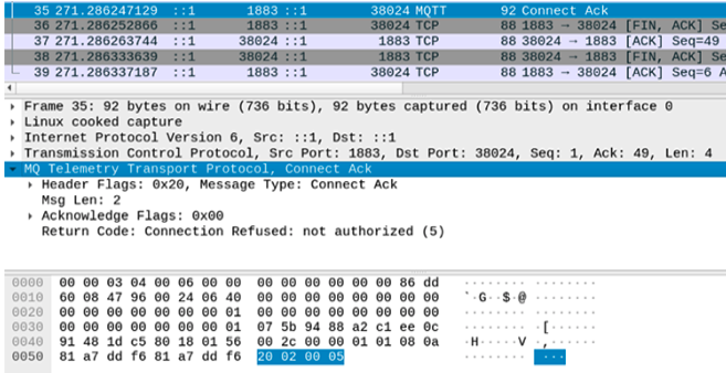 - Plaintext MQTT przez niestandardowe porty (np. TCP/8001) zamiast MQTTS. Każdy obserwator on-path może odczytać poświadczenia i ramki sterujące. Użyj Wireshark, aby wykryć ruch w postaci czystego tekstu CONNECT/CONNACK i SUBSCRIBE/PUBLISH na nietypowych portach.